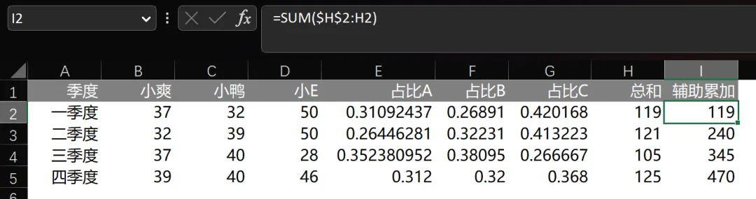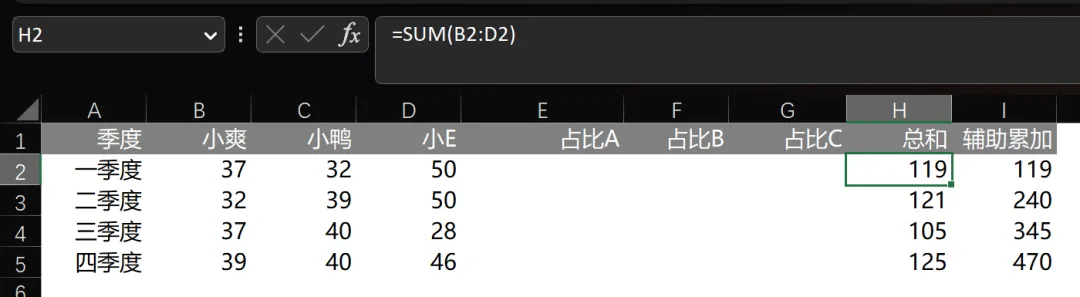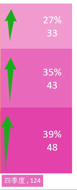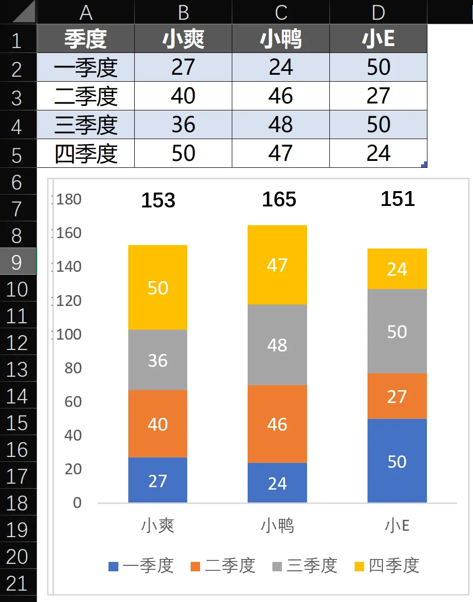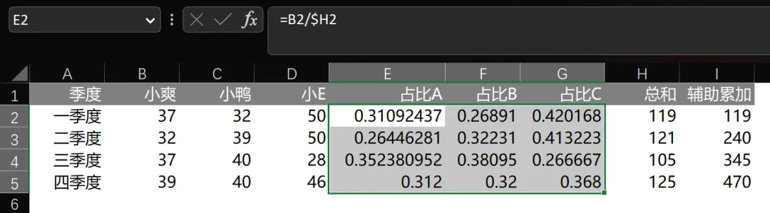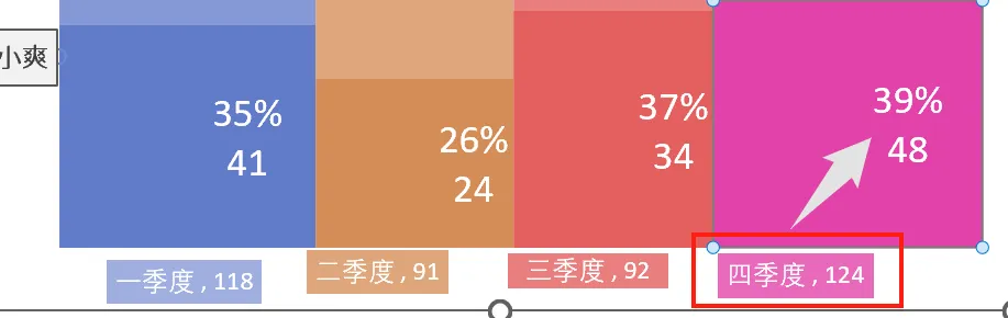 比如说,小爽在第四季度总和为 124。在第四季度中占比为 39%