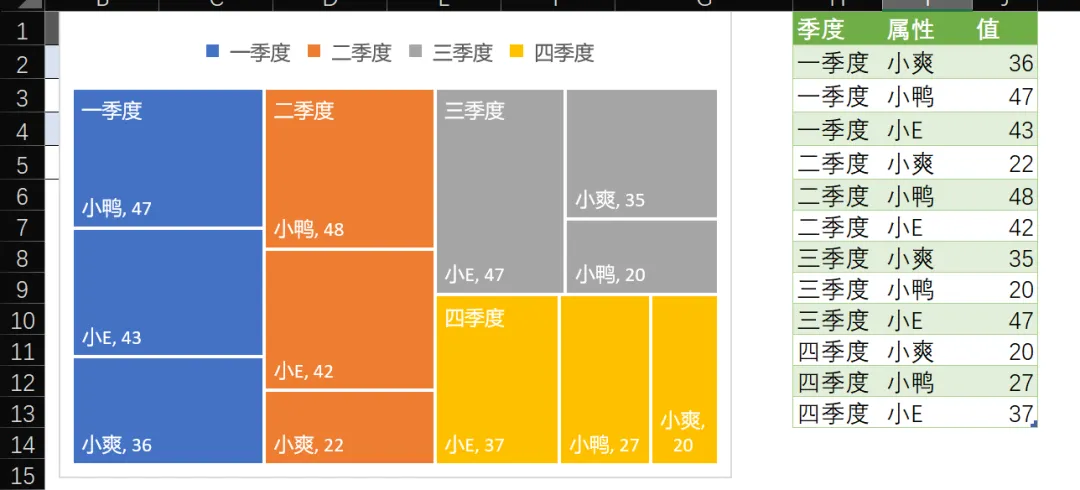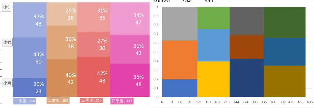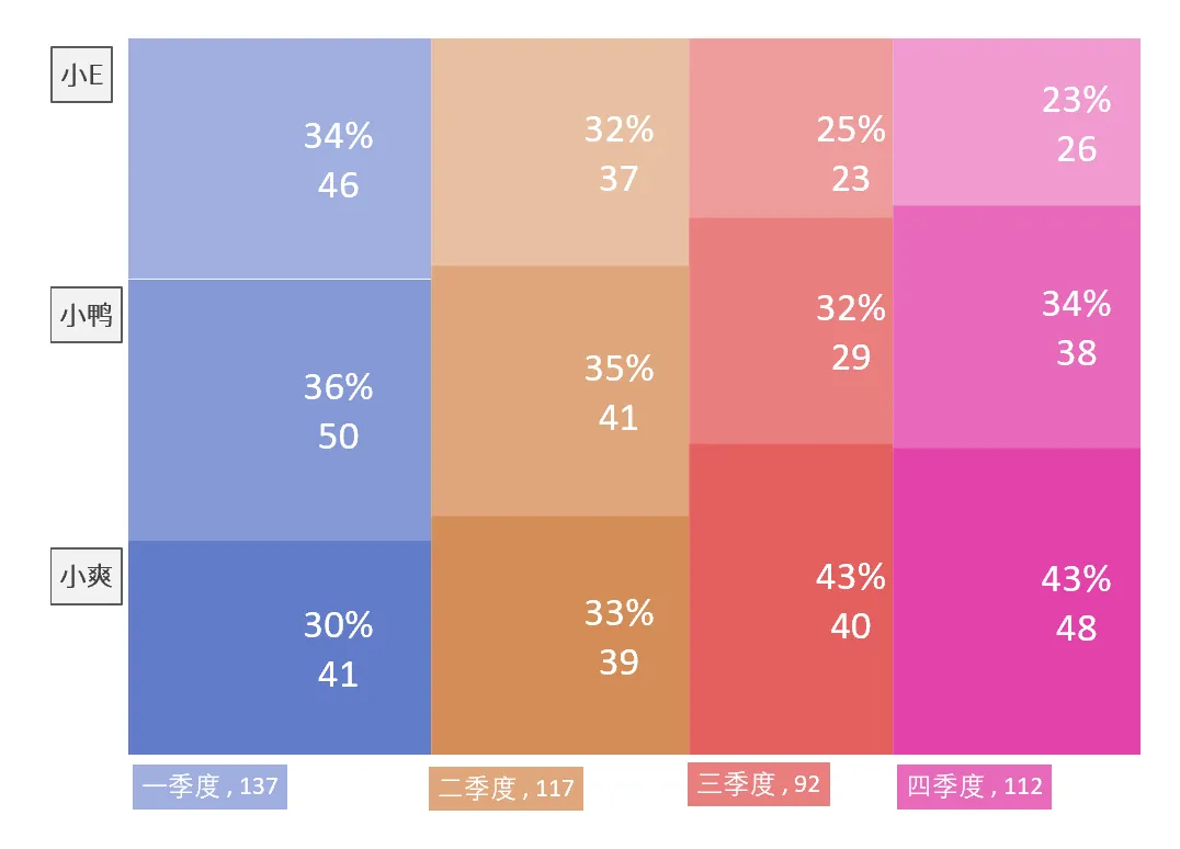思路分析:面积=长*宽。长,是每个季度的汇总和;宽,为每个业务员占总和的百分比。
