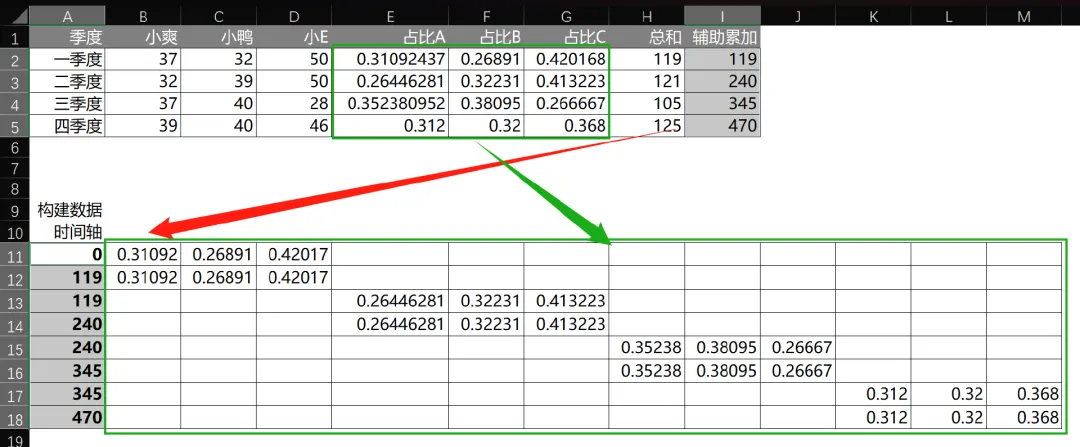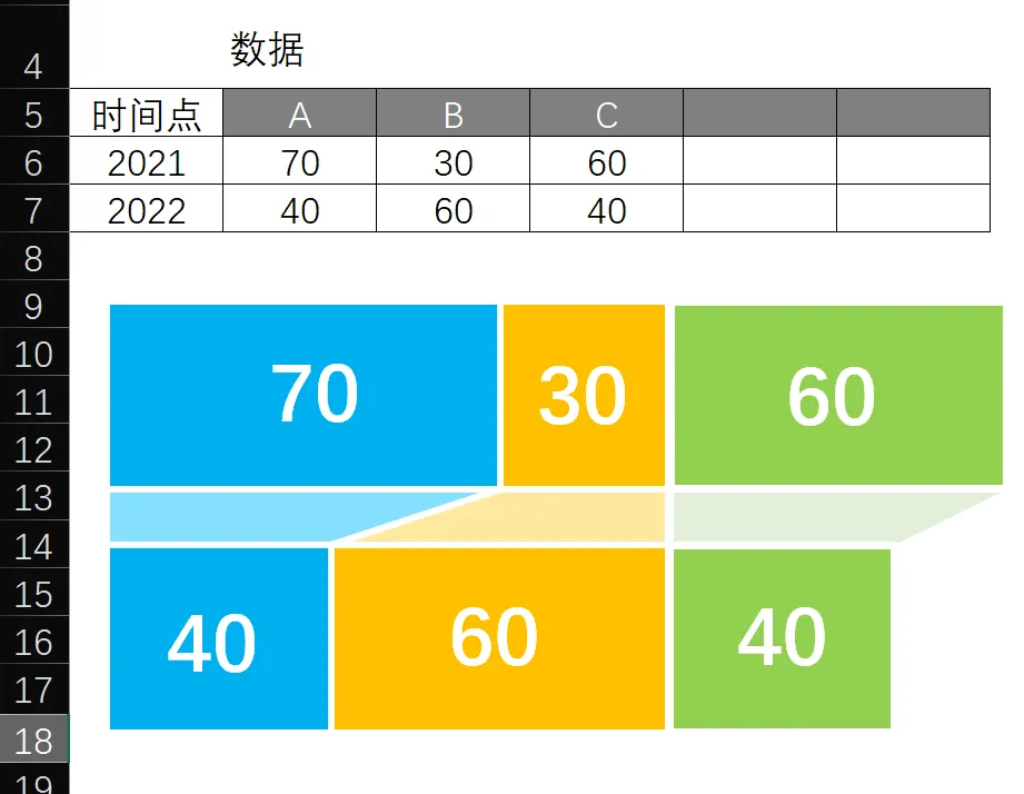 因为通过占比情况构造面积的大小。所以要制作这个效果,我们需要编写函数公式。提前算好占比,数据总和等。