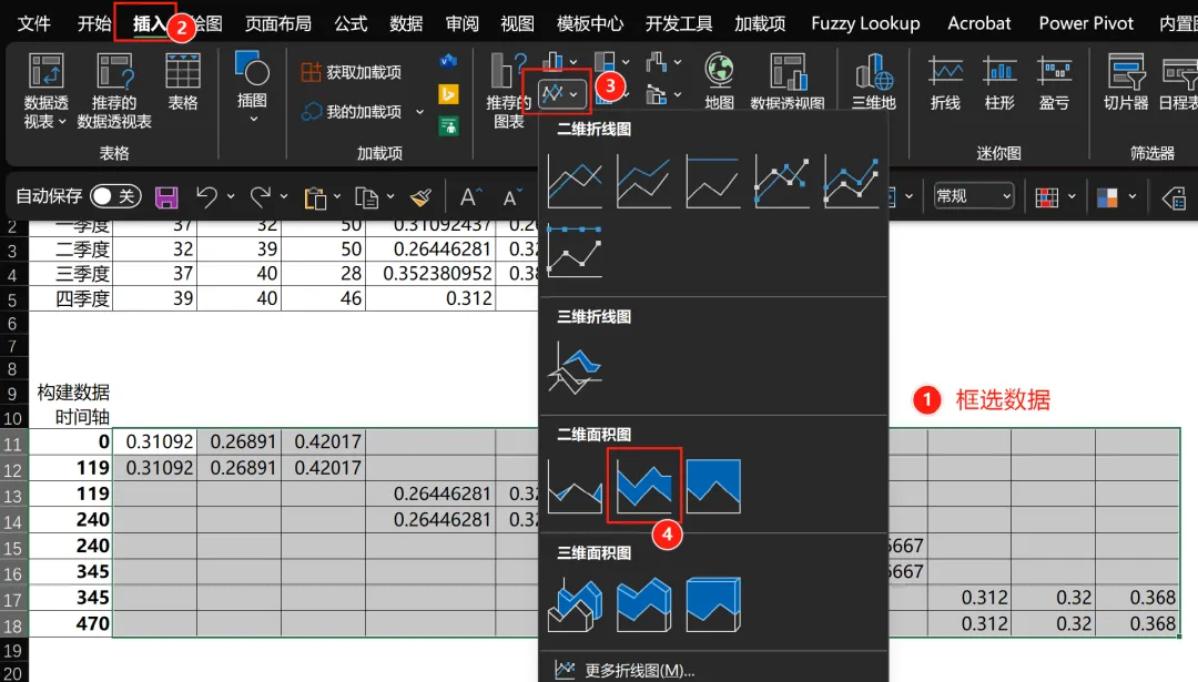 选择 B11 到 M18 数据区域,在【插入】选项卡下,选择折线图,堆积面积图。