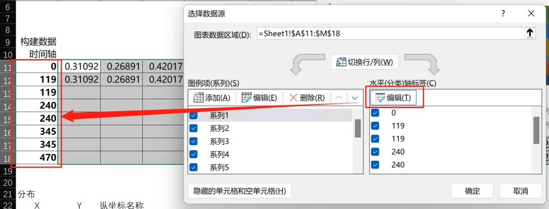 插入图表的时候,我们并没有将 x 轴的数据添加到表格中,所以还需要选择数据。