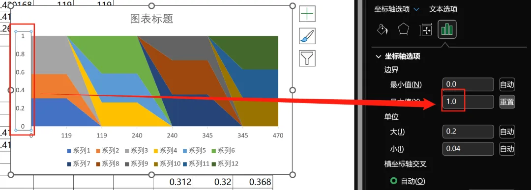 由于占比的最大值为 1,所以将纵坐标轴最大值写为 1。