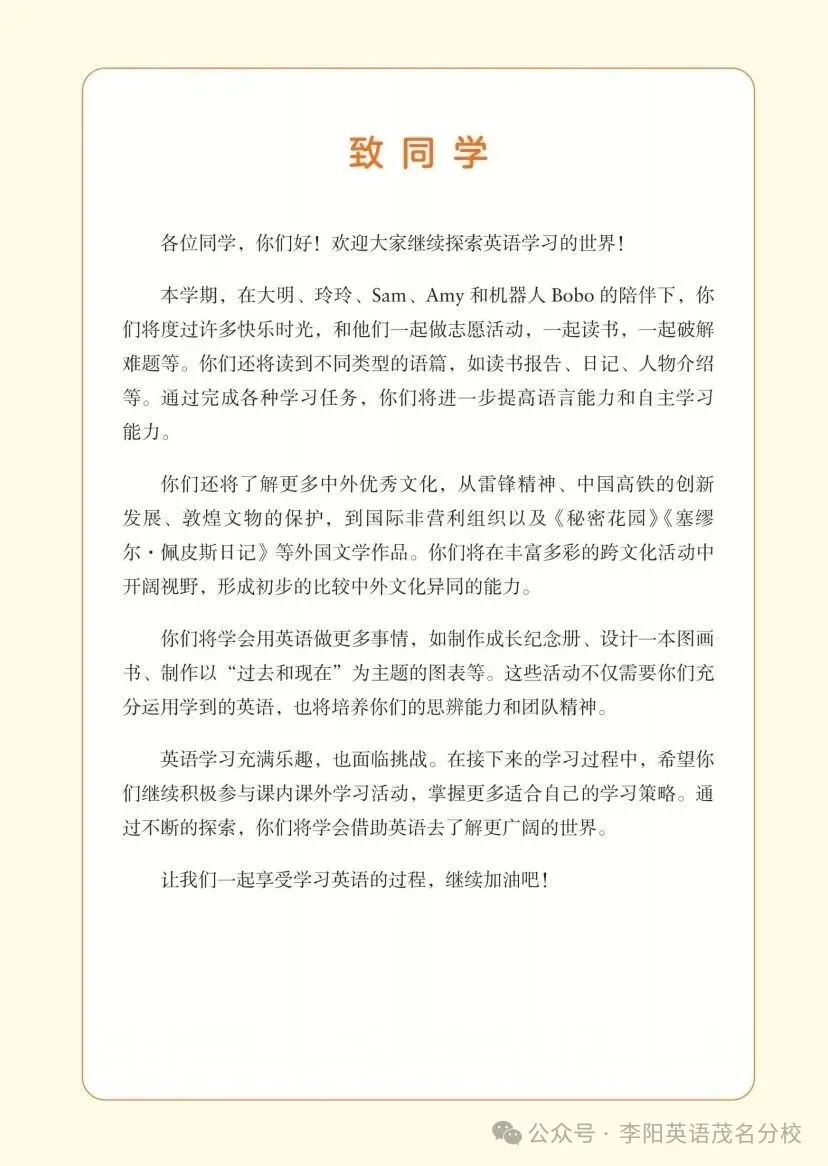 【英语 电子课本(2026版)】五年级下册(免下载,直接点读) 五年级下册 英语课本 点击本文左下角“阅读原文”,进入点读 关注本公众号,可以查看3-9年级上、下册 英语课本 课本来源:外语教学与研究出版社 五年级下册 英语课本 点击本文左下角“阅读原文”,进入点读 关注本公众号,可以查看3-9年级上、下册 英语课本 (本文内容来源于网络,仅供学习交流,版权归原作者所有!如有侵权请后台联系,感恩您的包容和理解!) 点击“阅读原文”,进入点读!