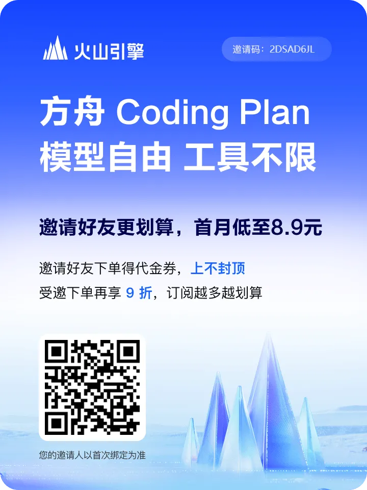 方舟 Coding Plan 支持 Doubao、GLM、DeepSeek、Kimi 等模型,工具不限,现在订阅折上9折,低至8.9元,订阅越多越划算!立即订阅:https://volcengine.com/L/dyinIvrOXX8/ 邀请码:2DSAD6JL
