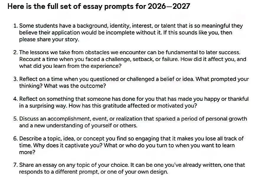 Prompt 7: Share an essay on any topic of your choice. It can be one you’ve already written, one that responds to a different prompt, or one of your own design.最后一题是一个非常开放的问题,看似范围很广,很容易写,但它却是七个题目里面最难的。这个题目要求你分享任何一个你感兴趣的话题,哪怕是你曾经写过的一个写作范例,也可以选择写小说、写诗等。它难就难在选择太多,学生往往无法把握住写作重点。但无论你选择的主题是什么,主文书的核心思想都不会改变:你能否通过这篇文书让招生官在阅读完后对你的形象有清晰印象,能否让招生官了解到你的特点。如果招生官在阅读完你的文书后仍然对你一无所知,那么这篇文书就没有达到其目的,所以学生需要通过文书描写自身最吸引人的点,让招生官记住。通过上面分析,相信大家都对Common App主文书都有了更深刻的认知。美本具体申请规划联系分享君哦~国际教育留学分享君是一个分享国际教育领域的优秀资源 (国际学校择校备考、标化语言培训、学科同步辅导、留学申请文书、竞赛背景提升、艺术作品集制作、考团签证实习、夏校研学义工营地、留学后海外学业、移民身份置业等)和干货信息的平台;此为资讯分享平台非机构本身。欢迎学生及家长关注,本平台筛选推荐合适的资源给到有对应需求的学生及家长!欢迎加入我们的资讯分享群,获取更多信息。