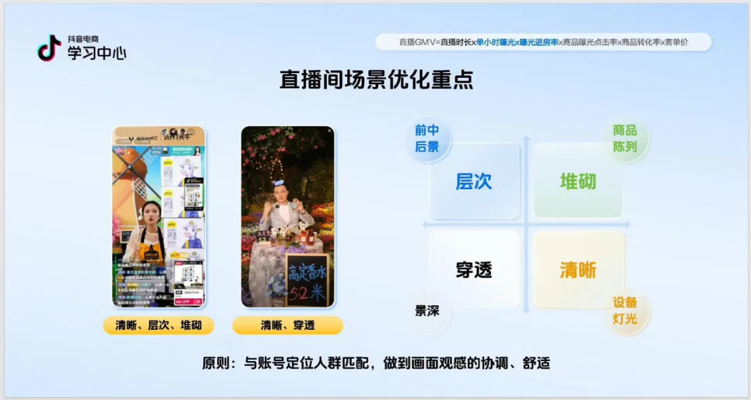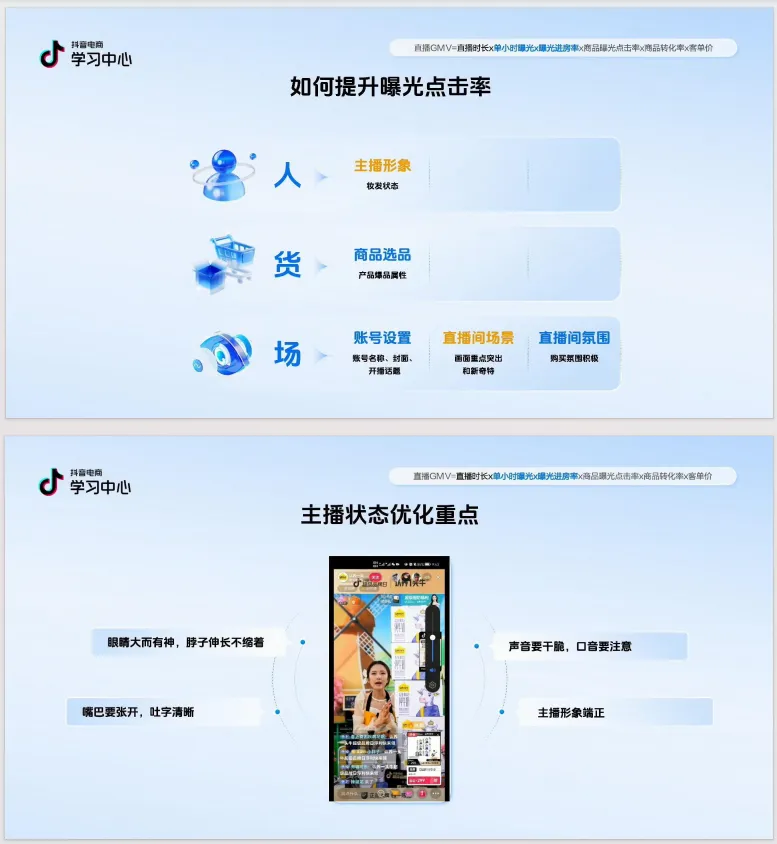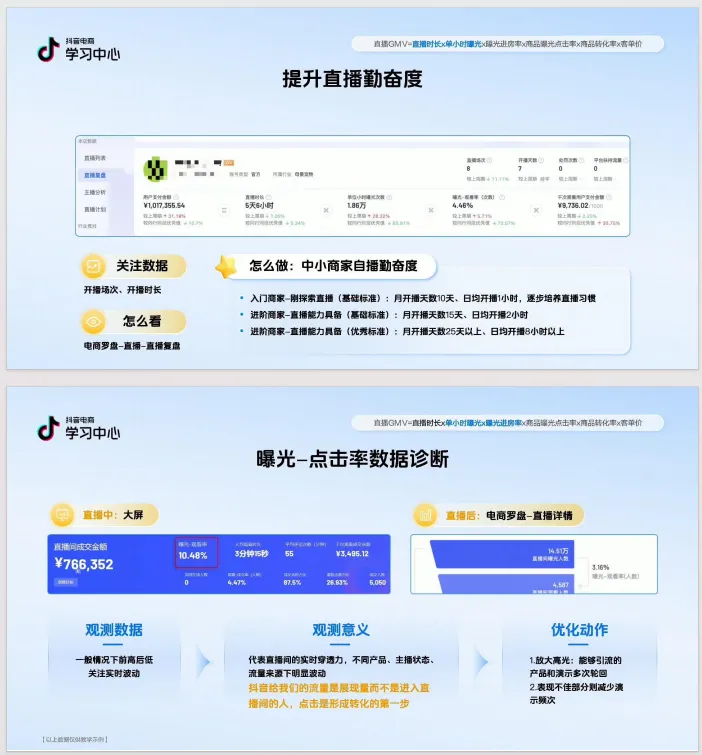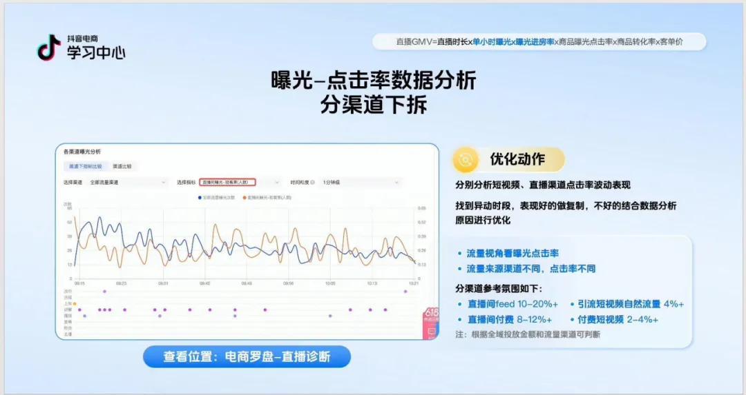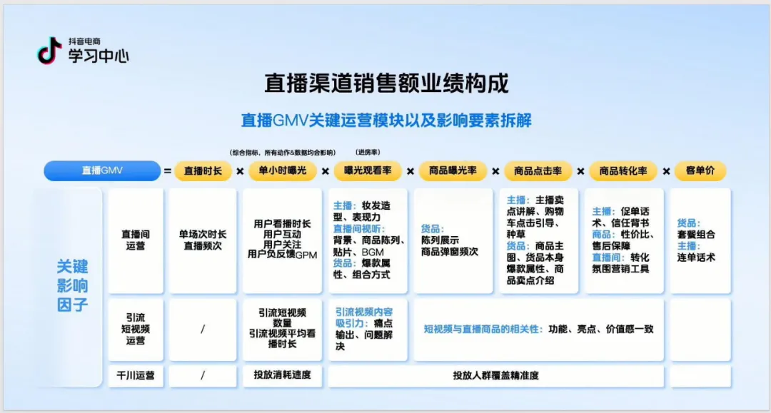 这份《抖音电商精细化商家经营全域诊断整体诊断思路指南》62页,核心围绕直播 GMV 拆解诊断法展开,明确直播 GMV = 直播时长 × 单小时曝光 × 曝光进房率 × 商品曝光点击率 × 商品转化率 × 客单价的计算公式,从多维度给出诊断与优化策略。指南先明确中小商家自播勤奋度标准,入门商家月开播 10 天、日均 1 小时,进阶商家分基础和优秀标准逐步提升开播时长与天数,可通过电商罗盘查看直播复盘数据。针对 GMV 各拆解指标,分别给出优化方向,曝光进房率需从人货场优化主播形象、商品选品、直播间场景与氛围;商品转化率要打磨主播促单话术、做好排品组货、借助营销工具烘托购买氛围,还可通过四象限话术诊断和选品四象限分析优化运营动作,同时需实时监测停留、互动、关注等指标,对优质话术和产品流程重复测试。引流短视频是提升单小时曝光的关键,核心看视频引流直播 GPM 指标,优化需匹配直播间爆款、强化信任背书、设计直播承接闭环,挂车短视频则要优化 2s 跳出率、完播率、互动率等内容指标和短视频 GPM 转化指标,通过强钩子设计、信息分层、单点突出卖点提升引流效果。千川投放方面,按冷启动、成长、成熟阶段划分工具选择与投放方式,需筛选优质素材追投,监控全域计划衰退指标,应对投放掉量问题,针对直播没流量或不稳定的情况,从进房率、停留时间、转化数据分析原因,单场和场次间不稳定有不同的承接与拉升策略,同时要正确认知抖音流量波动的正常性,做好流量上升承接、下降拉升。指南最后给出利润提升思路,通过优化供应链、分析退货原因降低退款率,搭建最小单元团队提升人员效率,做好内容素材复用,核心通过消费者生命周期管理对潜客、新客、老客分层运营,搭配会员体系和私域运营延长客户价值,同时做好商品生命周期管理,完成新品测试、爆款维护、库存品处理,优化货盘流转降库存,实现全店利润提升。全文还提及各核心指标的查看路径,多依托电商罗盘等平台工具,让商家可落地执行诊断与优化动作。