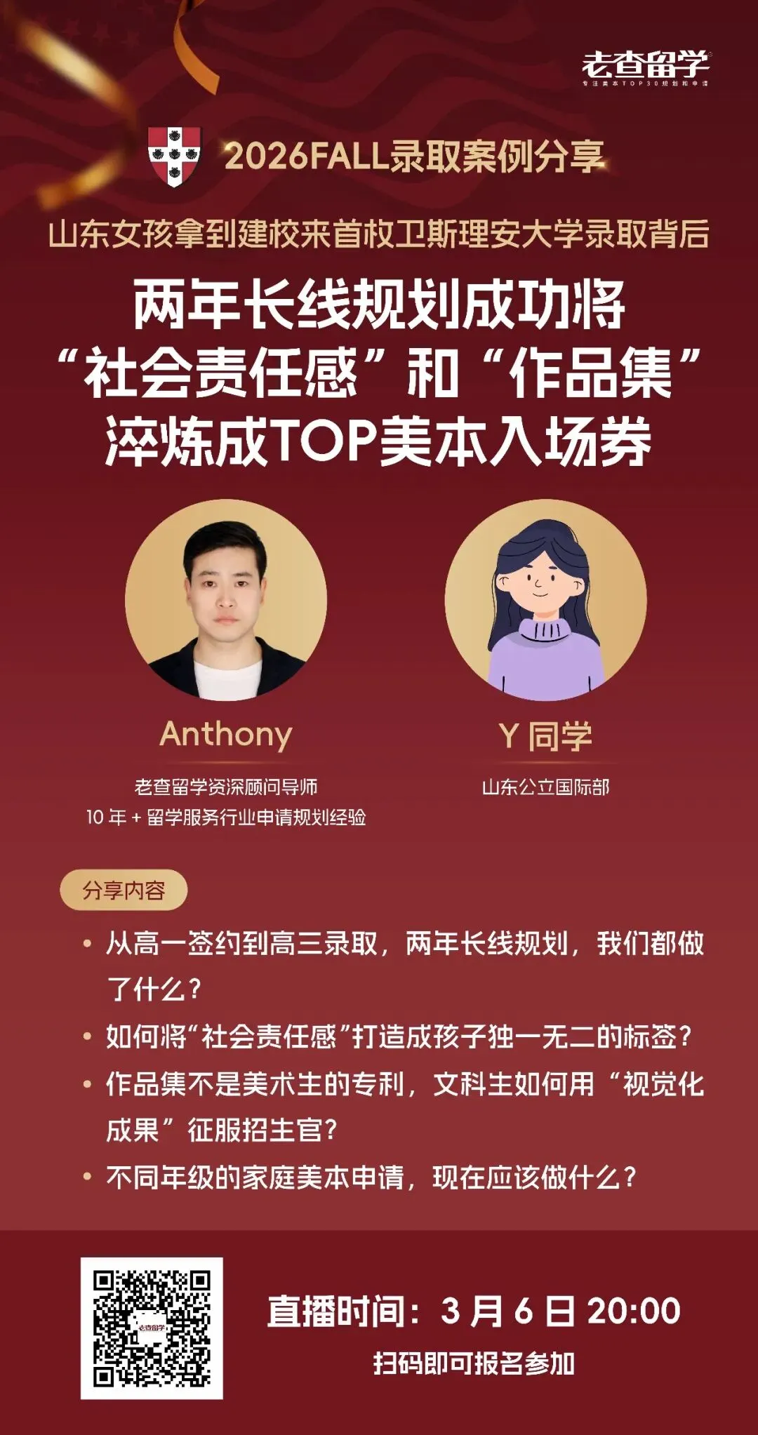 2026年3月6日20:00,老查留学资深顾问导师——Anthony老师将携手Y同学为大家带来一场毫无保留的卫斯理安大学翠录分享。