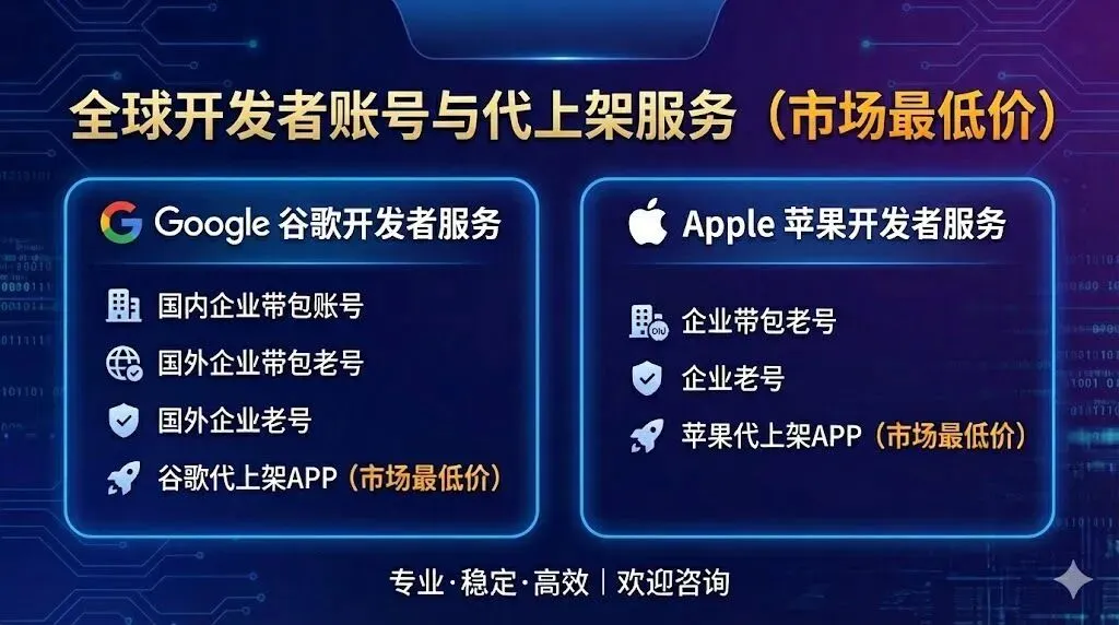 Google / Apple 开发者国内企业号、海外企业老号、高权重带包老号。 - 代上架服务: