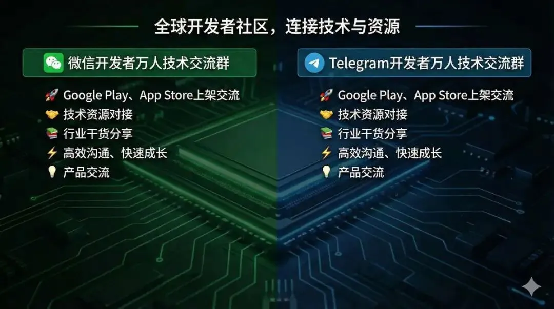 300+群组,万人免费对接。支付通道、上下游合作、各类牌照,社群内 1v1 免费匹配,拒绝割韭菜。 - 开发者技术交流群(微信/TG):