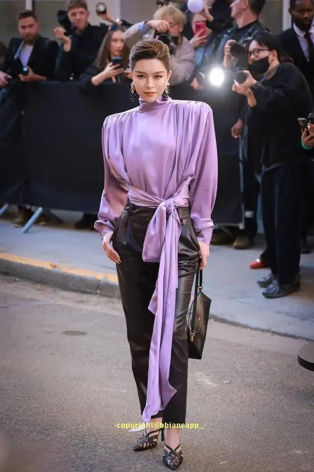 紫色本身就特别挑人,缎面材质又极其考验身材和气质,再加上夸张的垫肩设计,稍有不慎就会翻车。