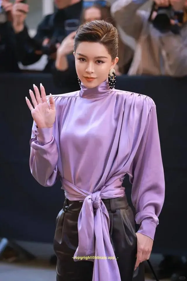 先说说文咏珊,这次她选了一件紫色缎面垫肩上衣,搭配黑色皮质长裤,走的是大气利落的路线。