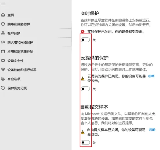 2.点击【病毒和防护保护/威胁防护】》》点击右侧【管理设置】,将【实时保护、云提供保护、自动提交样本】全部关闭。