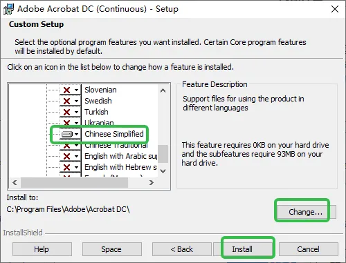 3、语言检查(检查简体中文是否选择)及安装位置更改,点击【Change】更换安装位置(注意:更改位置不能带中文或特殊符号),然后点击【Install】。