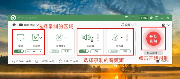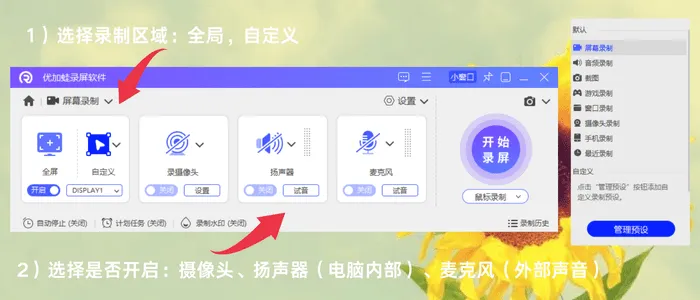 步骤2:可按需选择录制区域,支持自定义区域录制或全屏录制;是否开启摄像头录制可自主决定,同时需选定录制的音频源。