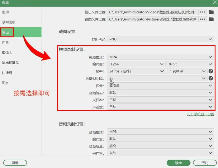 点击输出设置,可修改视频的格式、帧率、画质等相关参数,设置全部完成后,点击“REC”按钮就能启动录制。