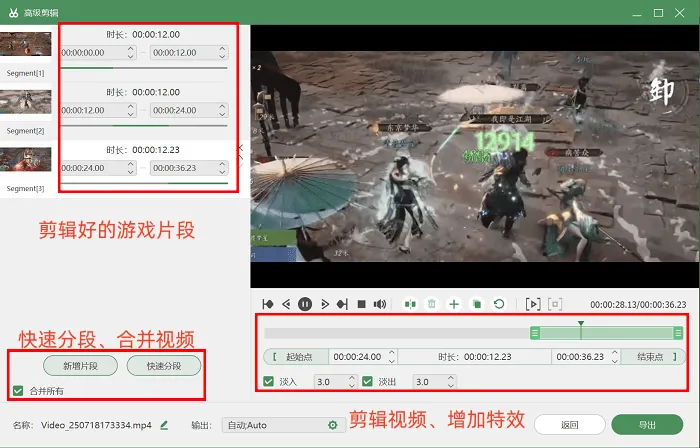 步骤3:录制结束后,还可以进行一系列高级剪辑操作,例如视频重命名、快速拆分视频片段等。