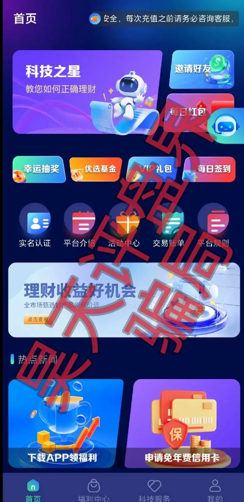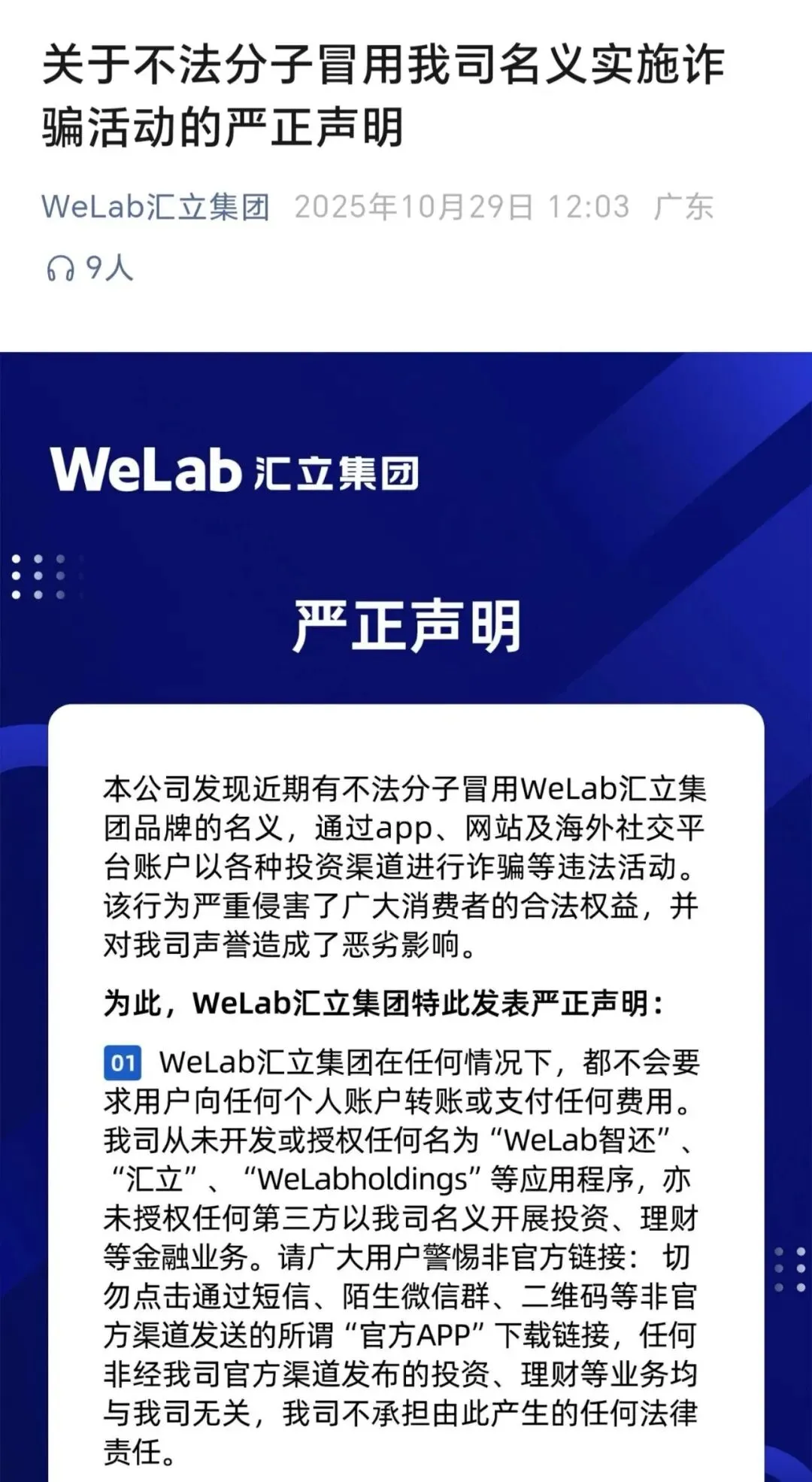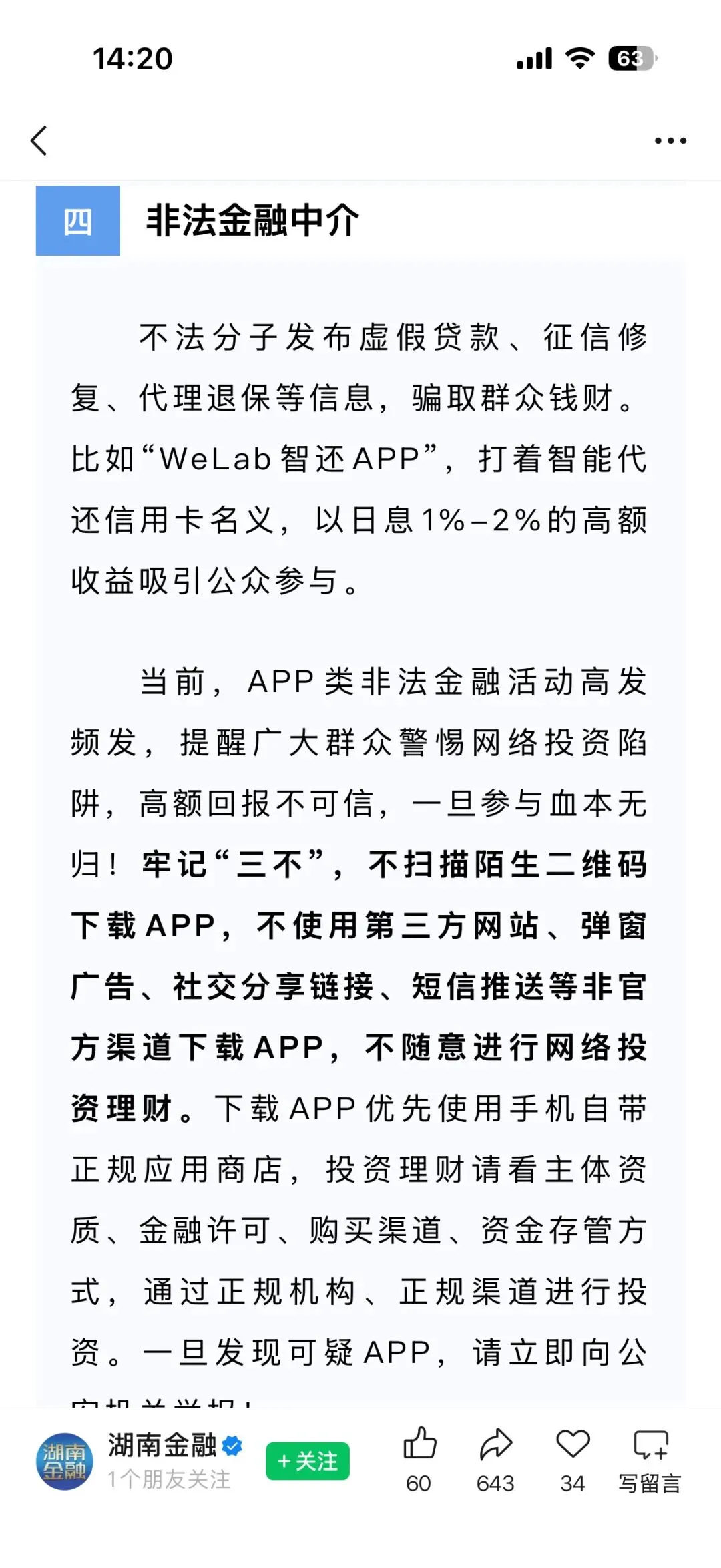 昊天评盘界:近期不少粉丝爆料了一个叫WeLab智还app的骗局,昊天看了一下这又是一个套牌正规公司资料进行诈骗的分红类资金盘骗局,不法分子发布虚假贷款、征信修复、代理退保等信息,骗取群众钱财,打着智能代还信用卡名义,以日息1%-2%的高额收益吸引公众参与,平台无实际代还业务,靠新用户充值支付老用户“分红”。下载时已提示高风险,也算是一个大盘了,运行了快一年了,近期正规公司已经出面打架,多地都发布了预警,据知情人爆料已经开始单割,部分会员已经不能提现,高度预警,即将崩盘跑路!