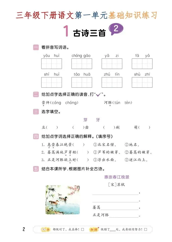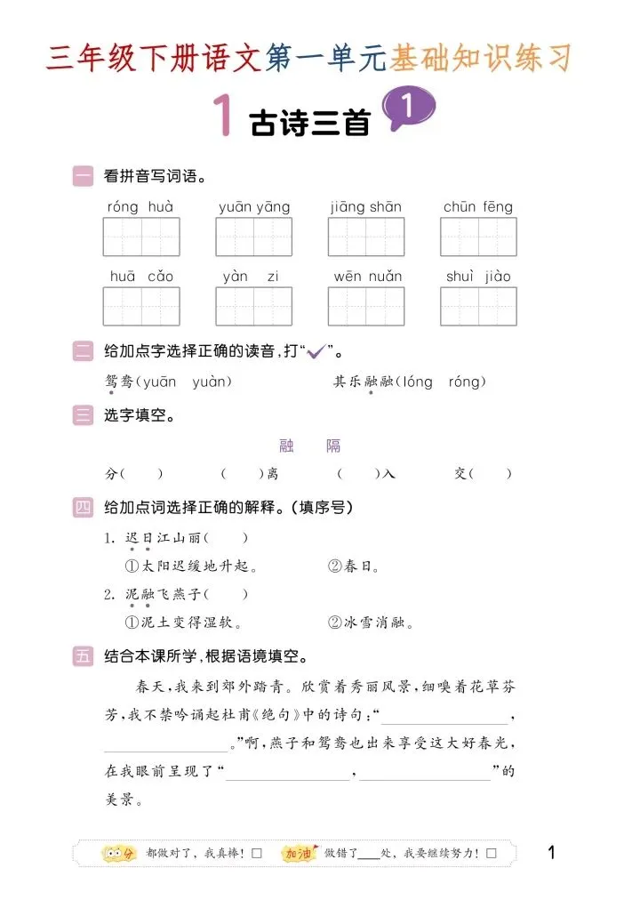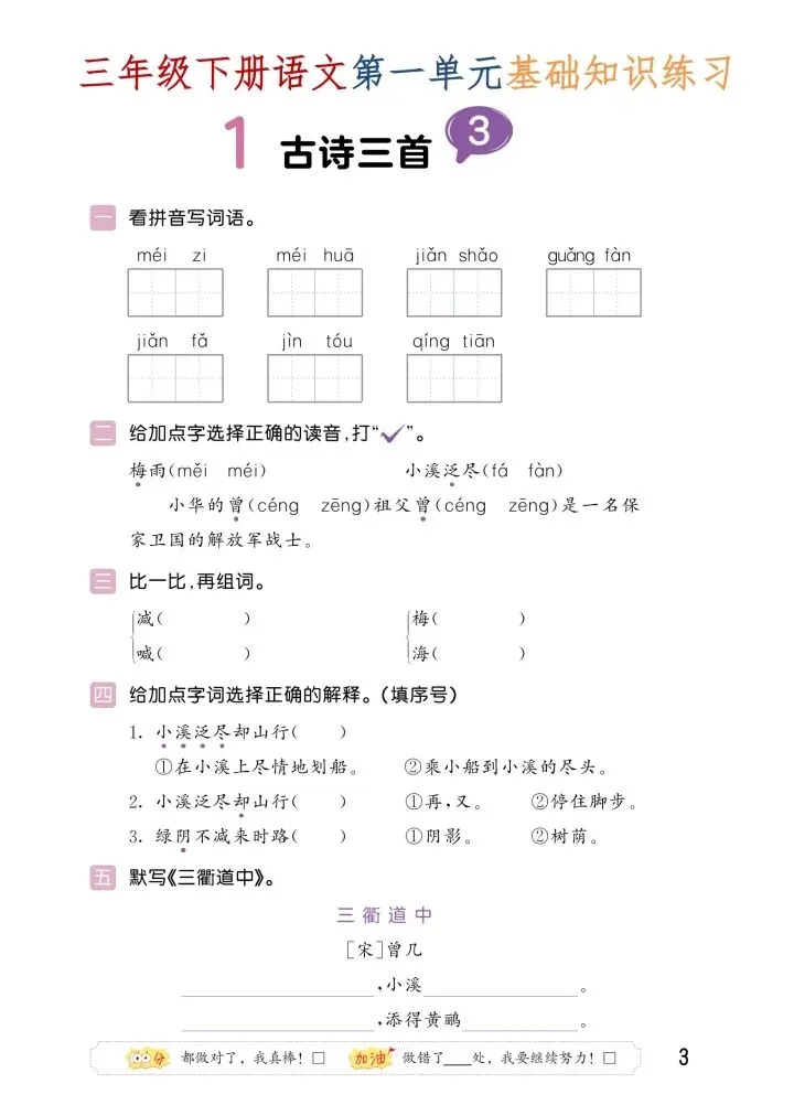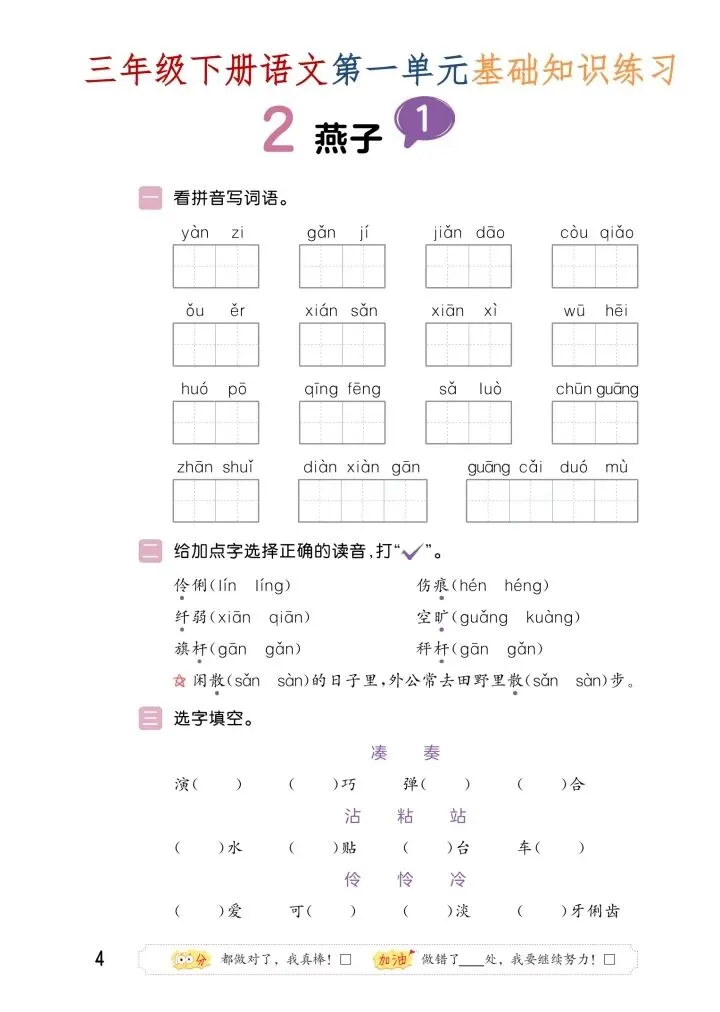 三年级下册语文第一单元基础知识练习.电子版可下载打印!