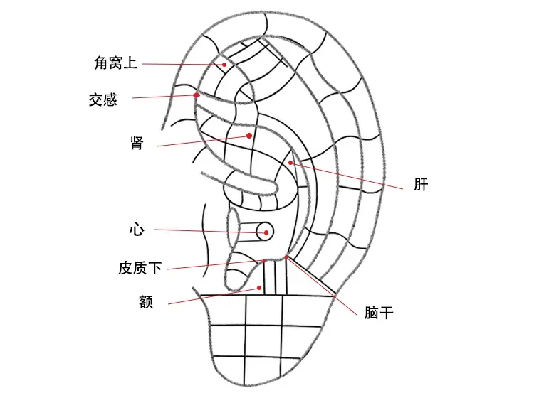 ②配穴:头晕——枕、晕区;脾虚者——脾;肝阳上亢——肝阳结节;烦躁——神门;