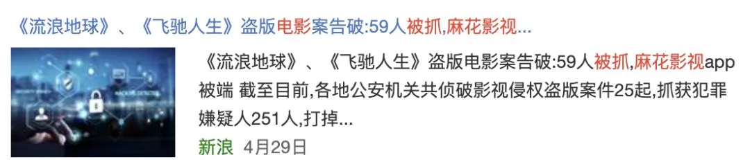 还记得机哥文章开头,机哥提过春节档电影盗版案告破,“麻花影视”被抓的新闻吗?