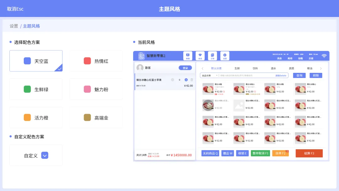 ui主题风格自定义:收银员在收银端可以根据个人喜好设置不同的主题风格,如天空蓝、生鲜绿、热情红、高端金等;