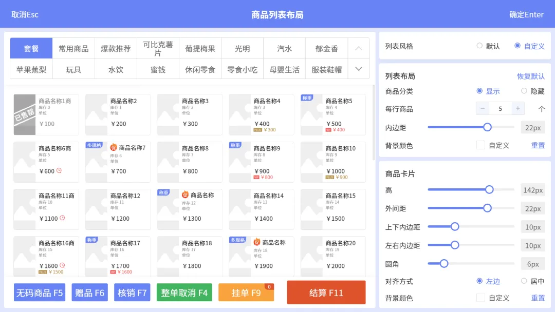 商品排列布局自定义:收银pos端收银员可以根据个人喜好设置商品排列布局,例如每行/每排的商品数量、封面图大小等;