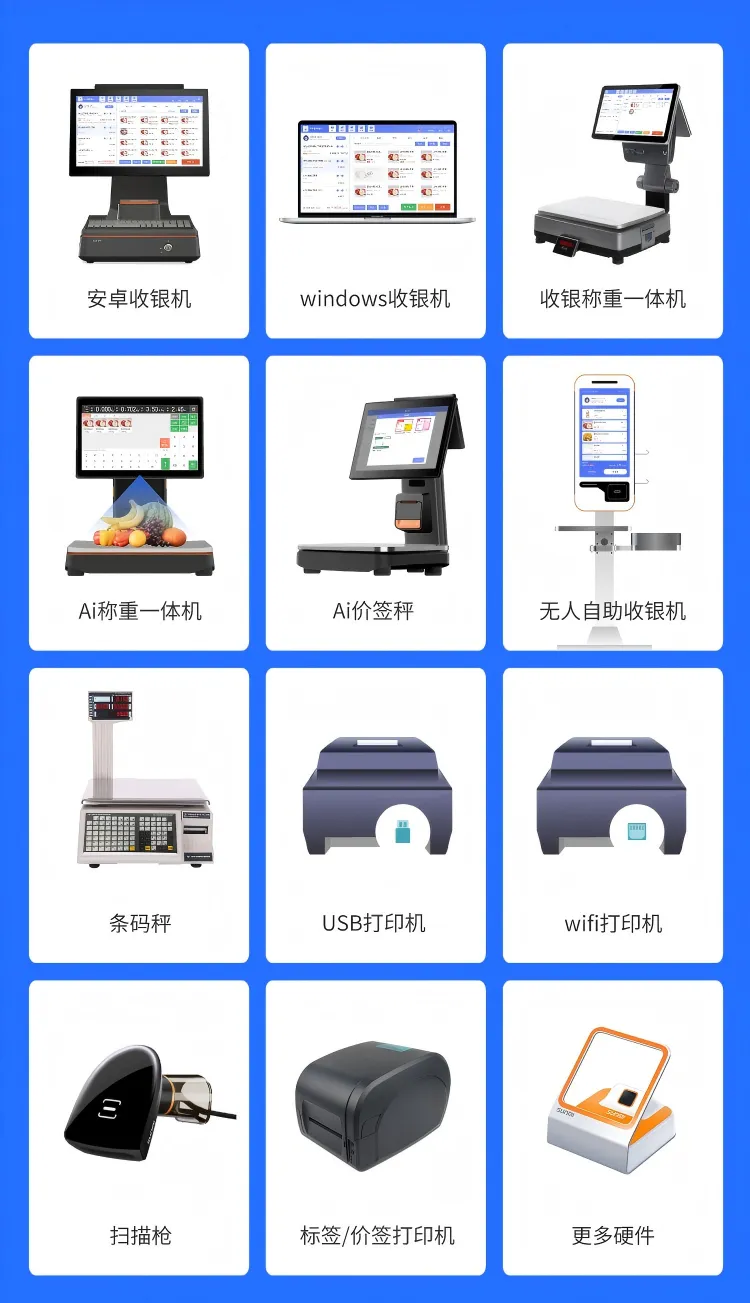 支持硬件:支持Windows收银机、安卓收银机、ai智能秤、收银称重一体机、无人自助式收银机、ai条码秤、标签打印机、小票打印机、wifi打印机、钱箱、扫码枪等;