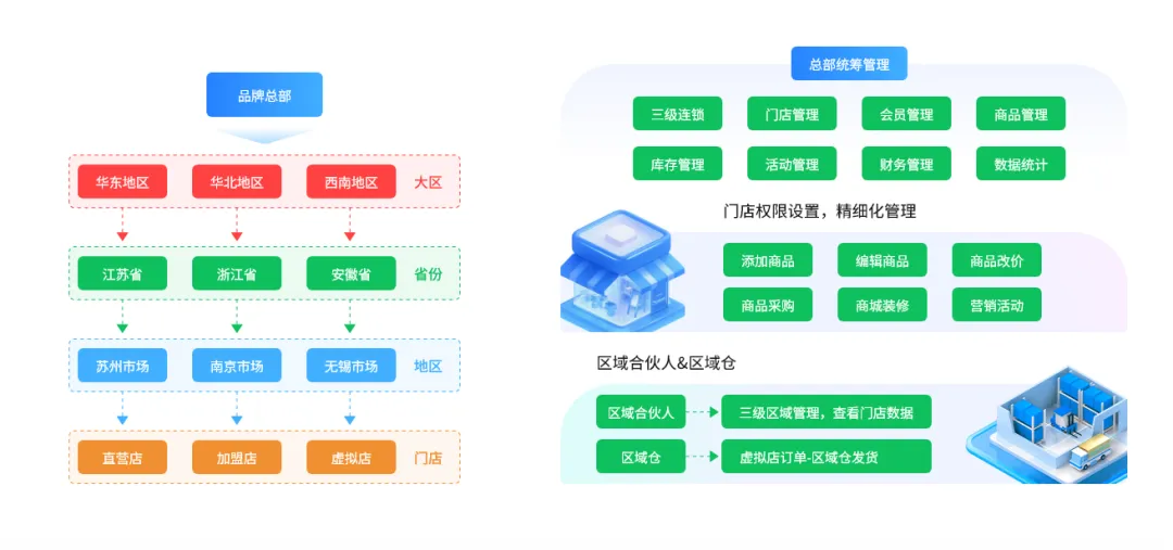 权限管控:总部可以管控门店的经营权限,如门店能否添加商品、采购商品、修改价格、商城门店页面能否diy装修等;