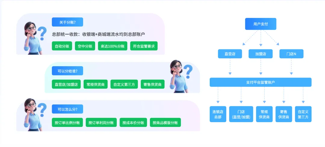 多业态分账:门店收银pos端和线上商城端都支持分账;