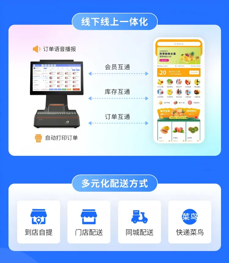 门店接单:线上商城下单,门店收银pos端语音播报提醒,订单小票自动打印;
