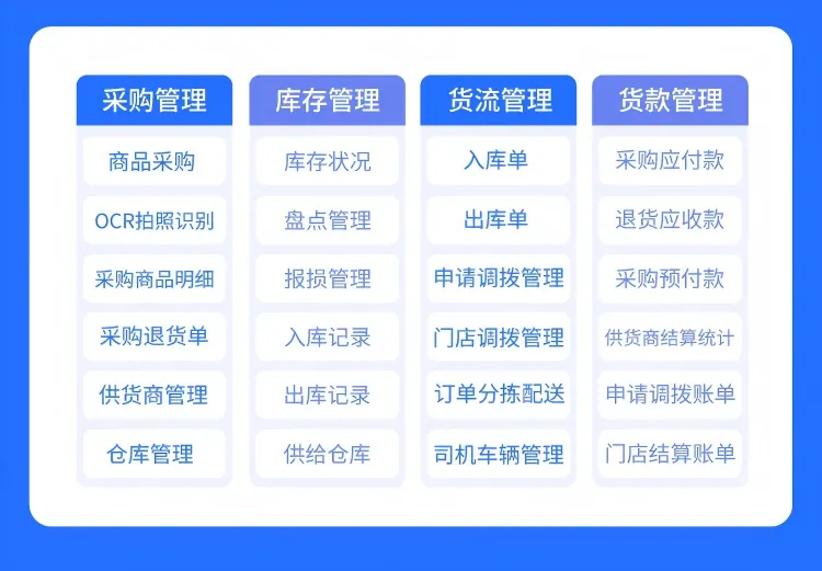 标配功能:标配了ERP进销存解决方案,给商户提供了含供应商统计、仓库管理,到商品采购、商品调拨,再到商品盘点、商品报损以及资金结算等一整套解决方案,让商户轻松管货。