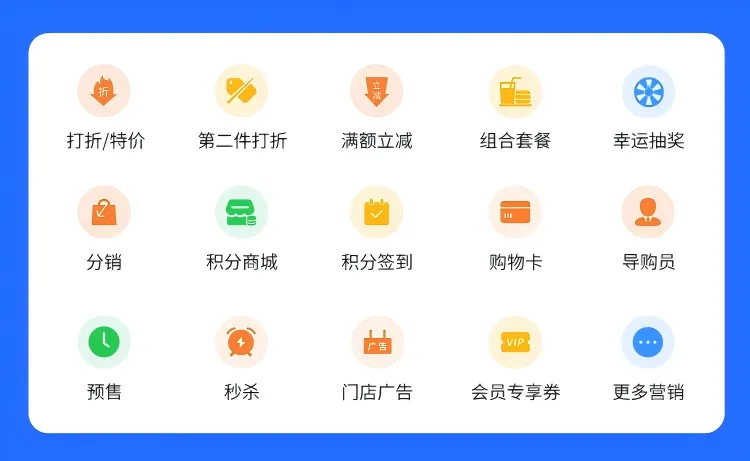 营销应用:支持分销、打折特价、第二件打折、满额立减、购物卡、组合套餐、门店广告、幸运抽奖、预售、秒杀等营销应用;