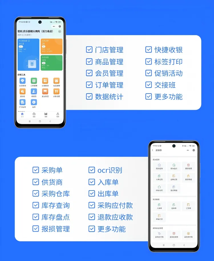 核心功能:包含门店管理、会员管理、商品管理、订单管理、ERP进销存、快捷收银、数据查询等;
