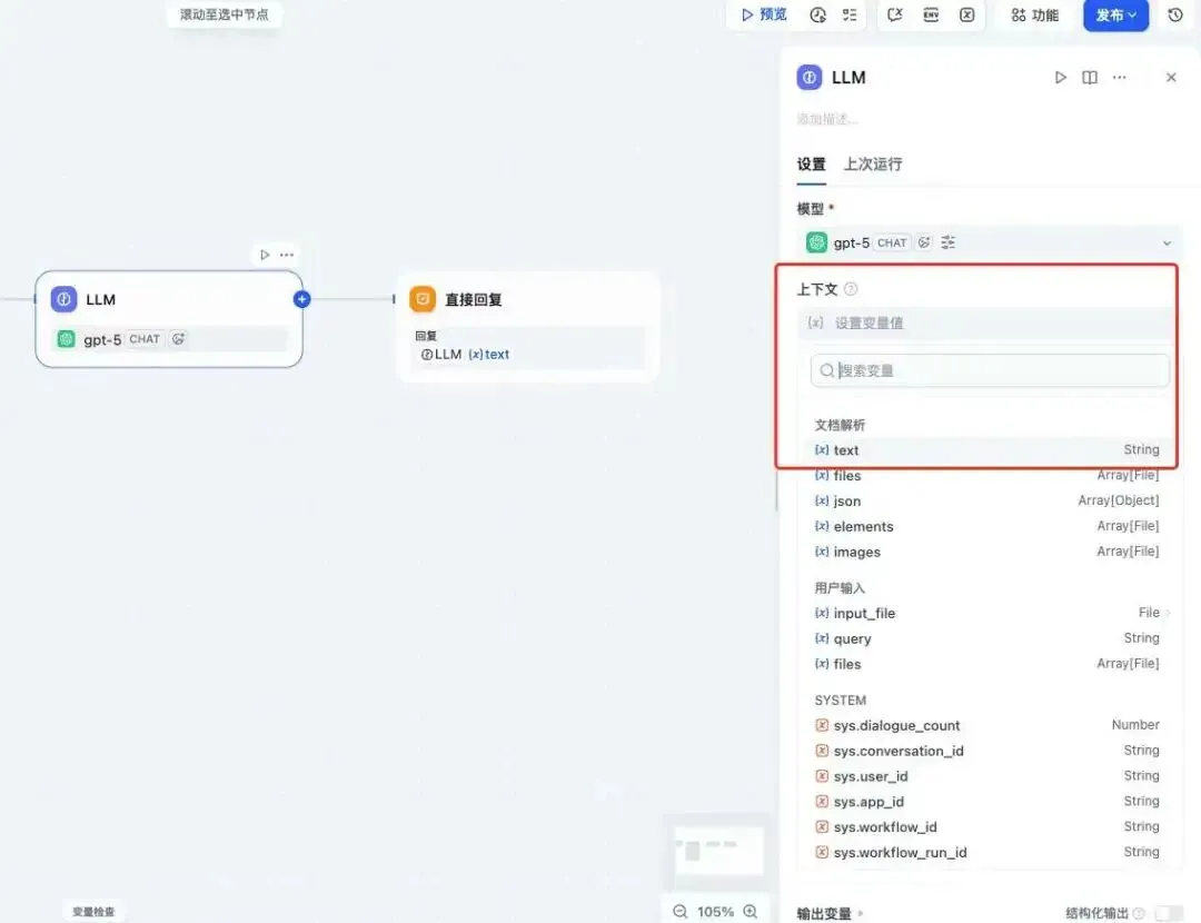 选择“LLM”节点后,如果没有模型可用,需要单独在插件市场安装(这里使用gpt-5作为示例)