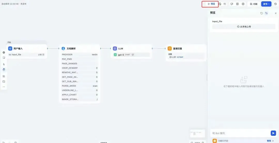 第六步:预览,上传文件并提问机器人关于文档的内容