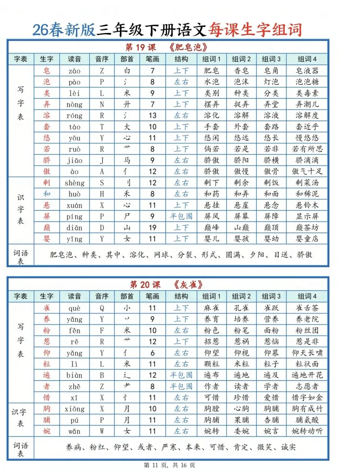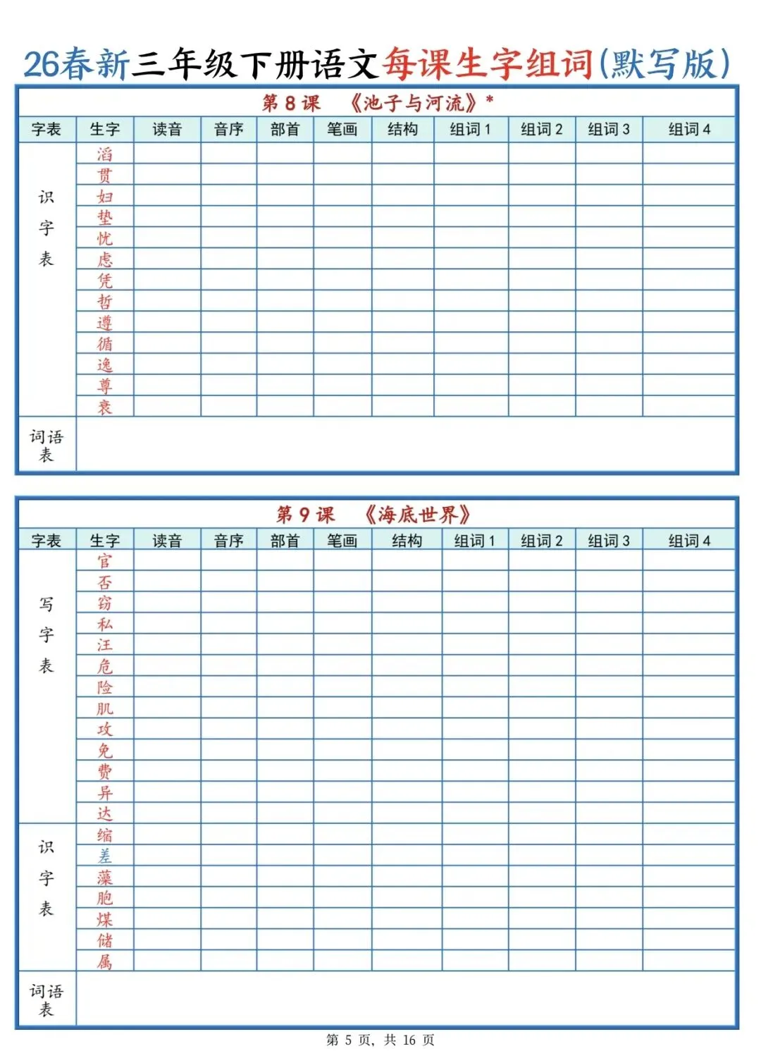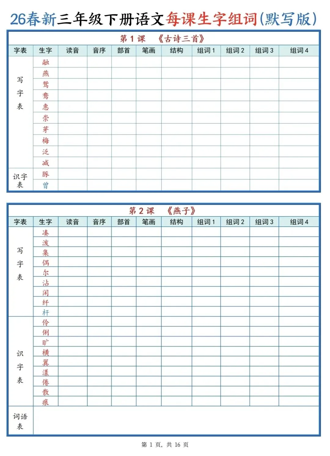 可打印!三年级下册语文每课生字组词(全册汇总),一课一张表,预习复习超省心!