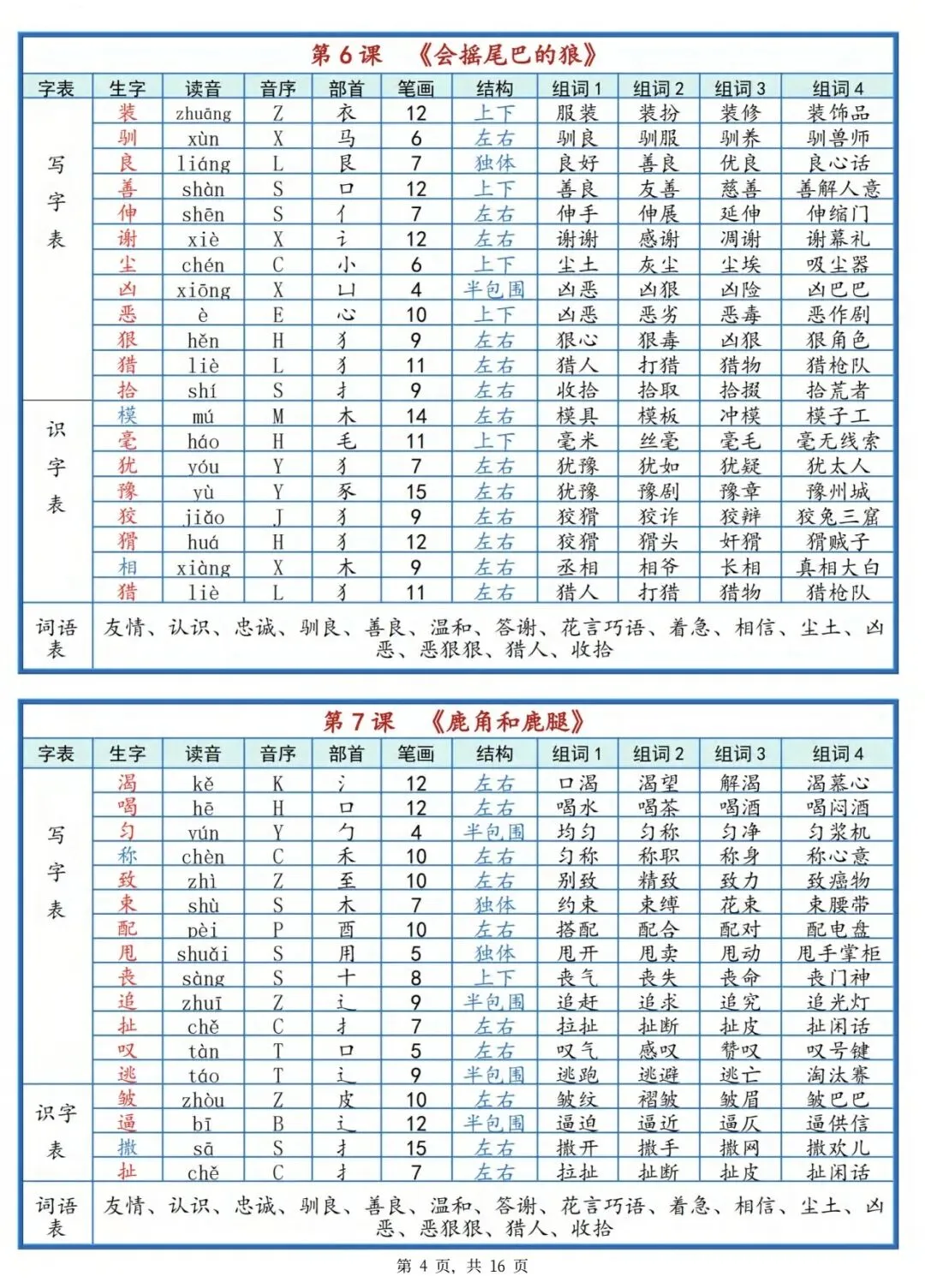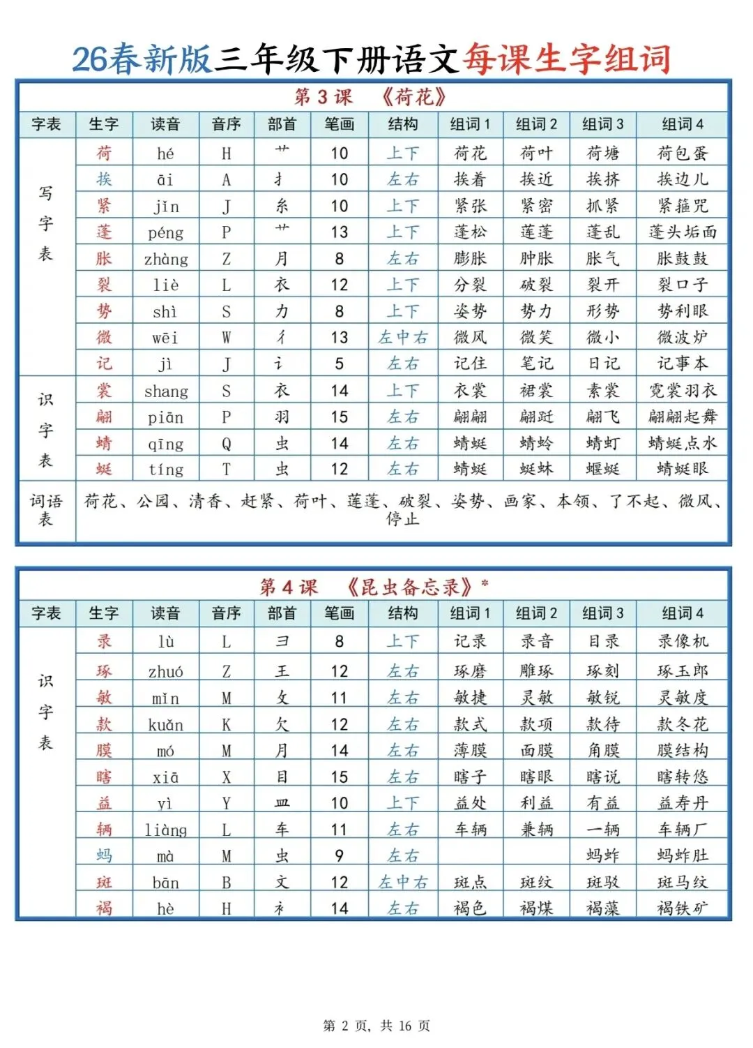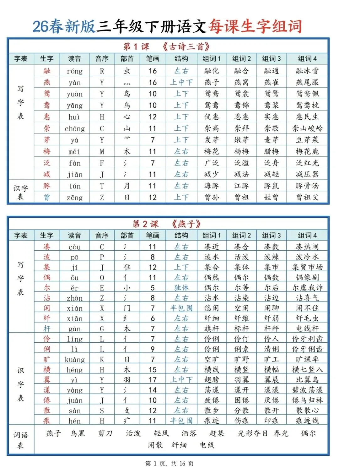 可打印!三年级下册语文每课生字组词(全册汇总),一课一张表,预习复习超省心!