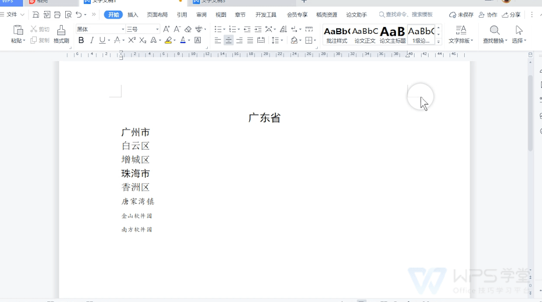 将1级标题根据要求设置为三号黑体,居中显示。剩下的多级标题操作同上。