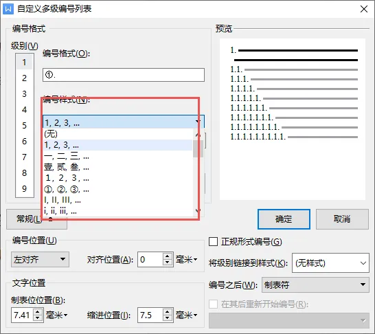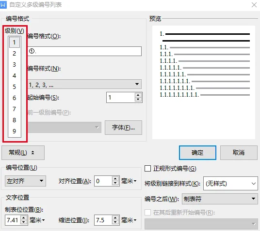 ▪「级别」,指的是1级编号、2级编号、3级编号等等,当我们想编辑1级编号的时候,选择“级别1”。