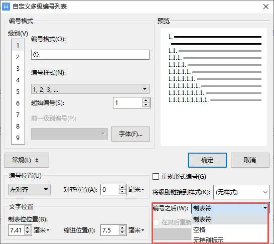 ▪「编号之后」指编号后面会显示什么。