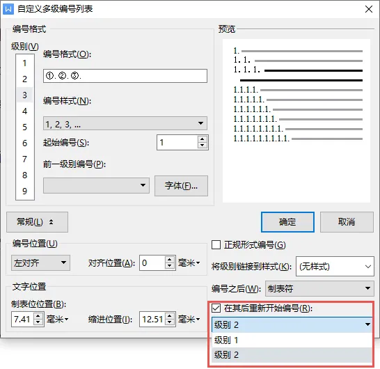 ▪我们按照上述方法,继续设置2级编号,1级以后的编号可以勾选「在其后重新开始编号」.