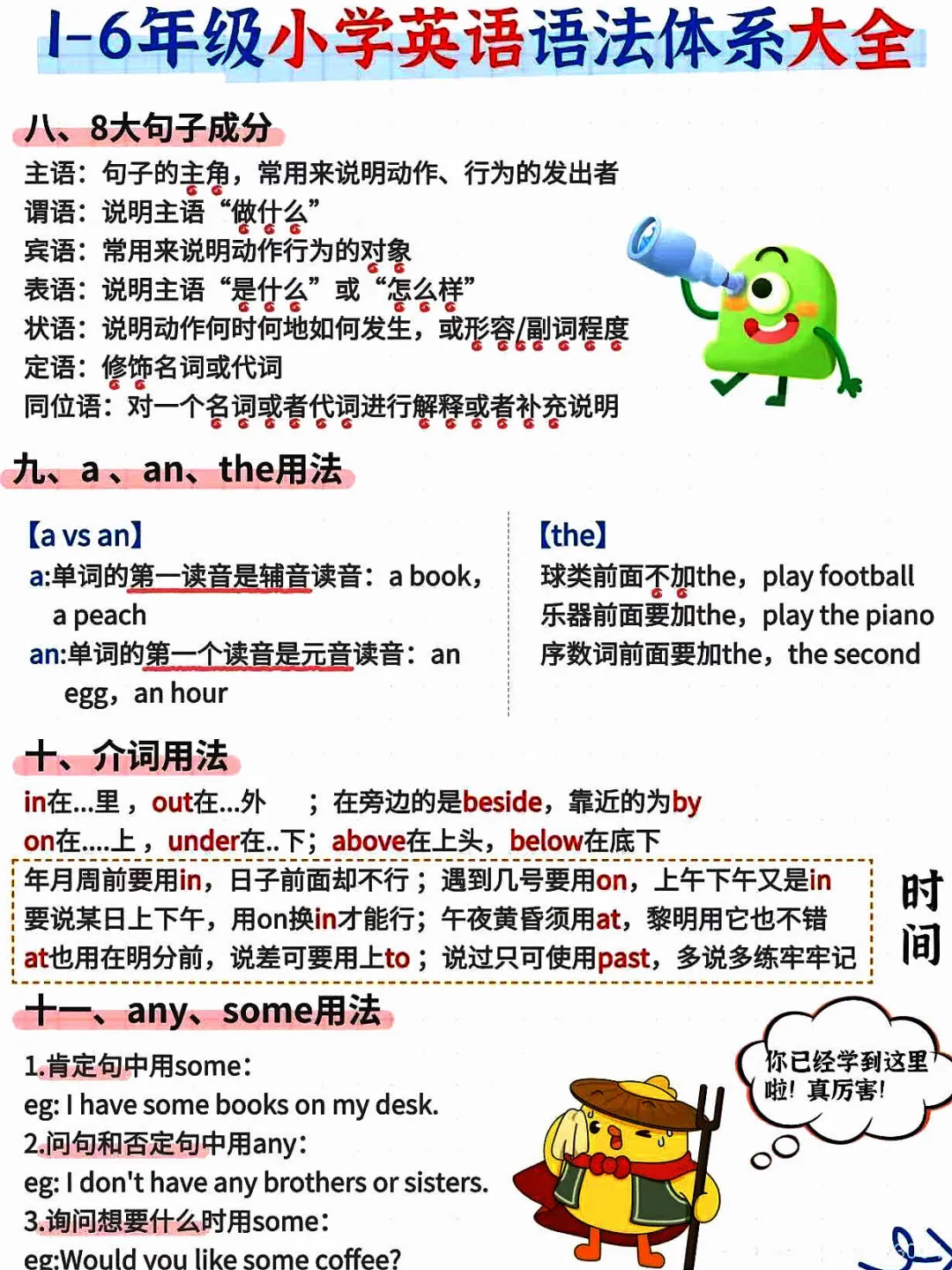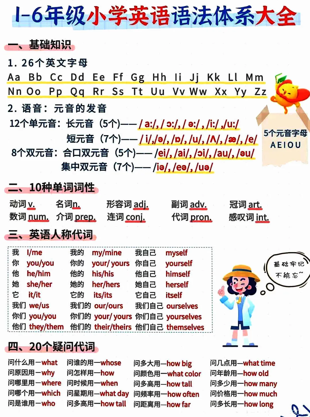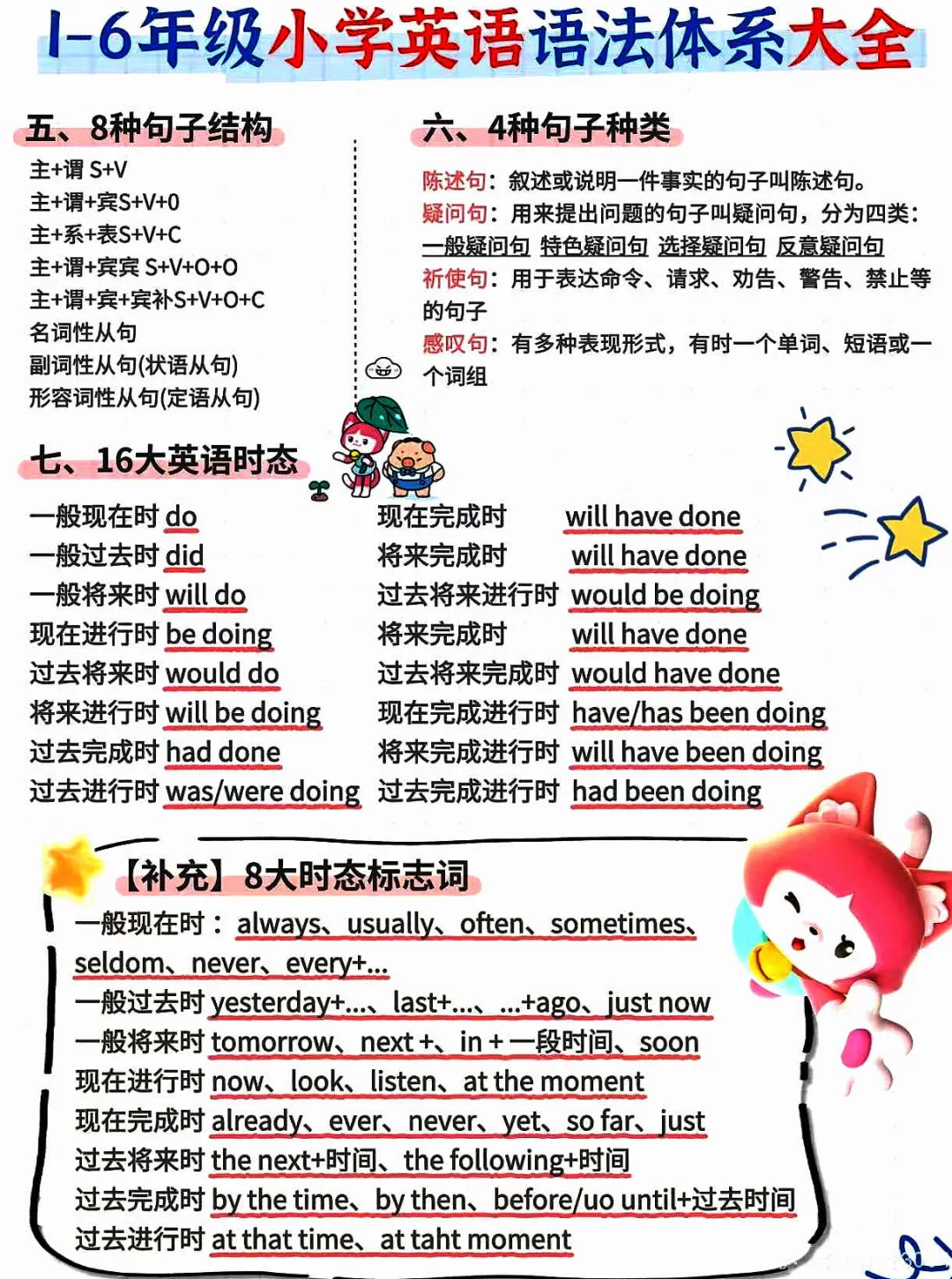 小学英语|语法体系大全(可打印) 资料来源于网络 资料收集者:Bacylee 关注👆公众号获取更多学习资料,喜欢就点赞收藏 🔊声明:本公众号尊重原创,意在学习与分享,相关权利为原作者所有,如有不妥请及时联系删除。