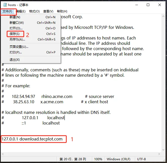 第二十步:1、如下图所示,在文档最后添加代码【127.0.0.1 download.tecplot.com】;2、选择文件,保存。