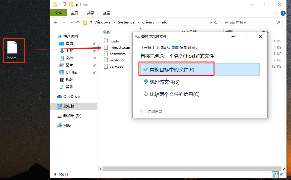 第二十一步:将桌面的【hosts】文件复制并粘贴在【C:\Windows\System32\drivers\etc】目录下,并【替换目标文件】。