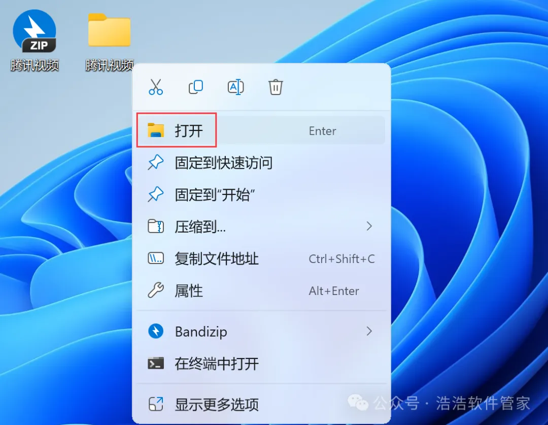 8、回到桌面,右键桌面上的【腾讯视频软件图标】,点击【打开】