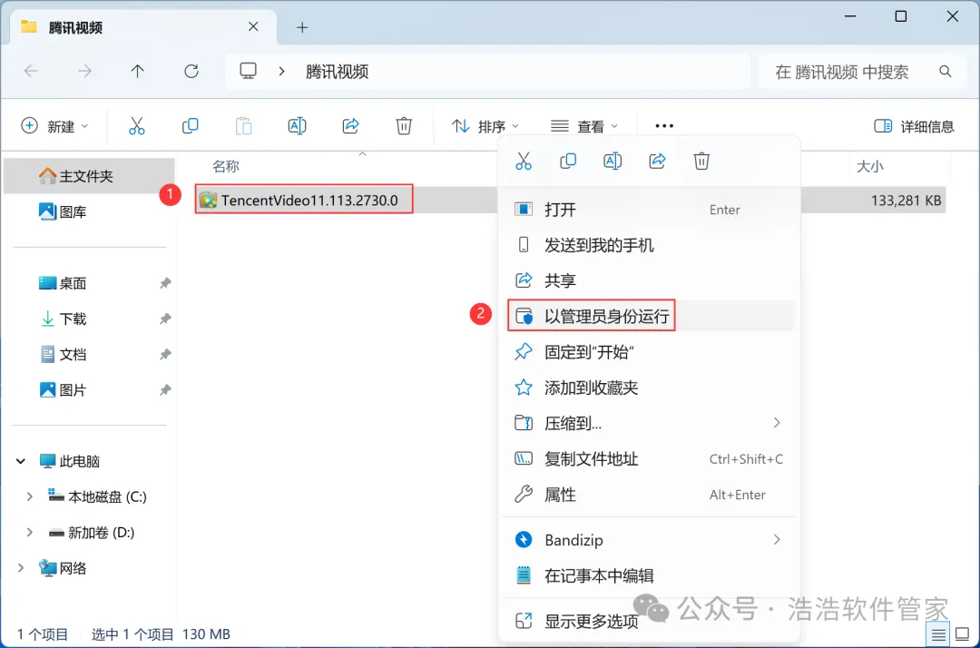 3、找到【腾讯视频】应用程序,右键选择【以管理员身份运行】它