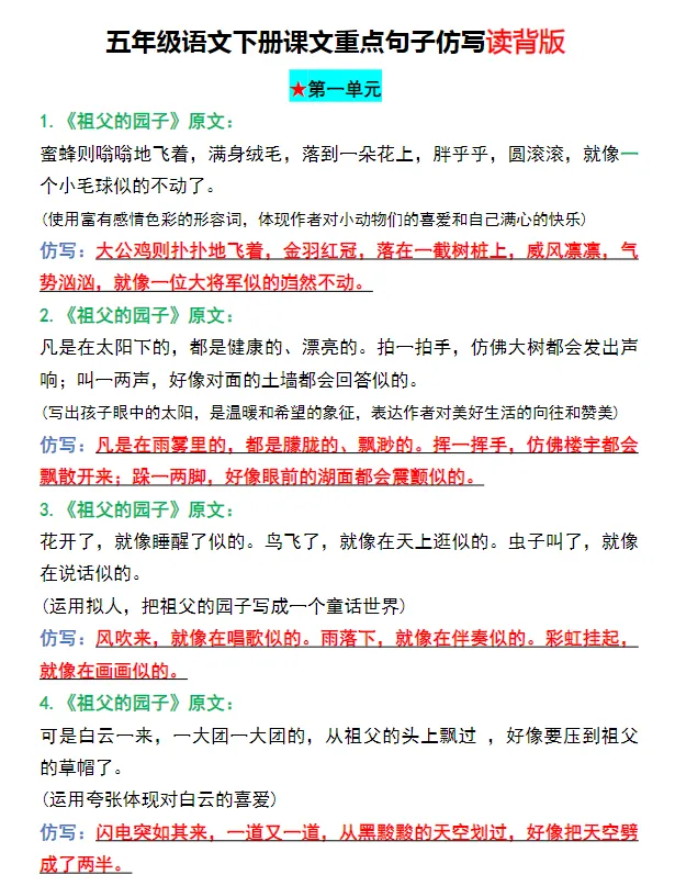 五下语文【必考仿写句子】读背版【可下载电子版】