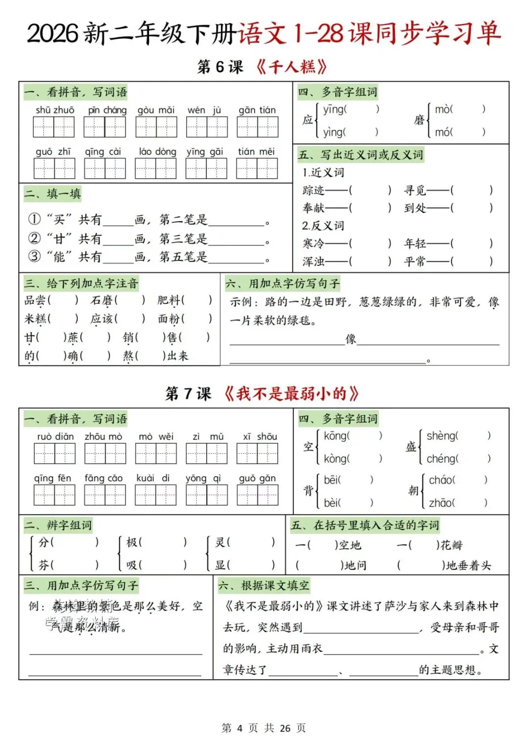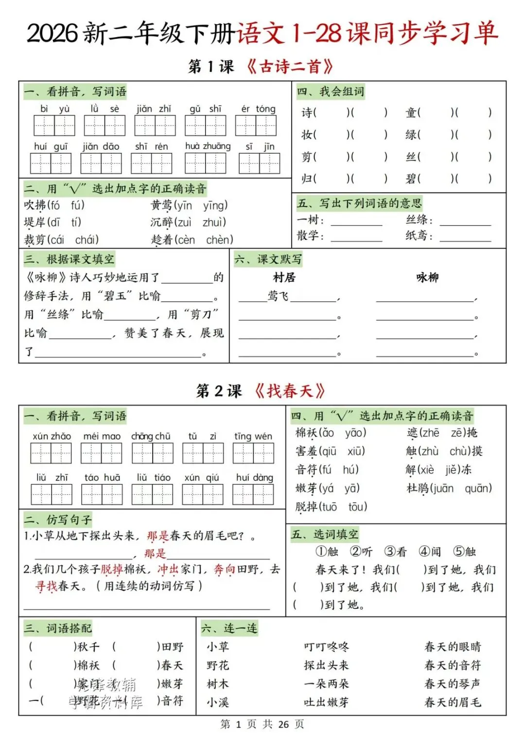 这份 2026 新二年级下册语文同步学习单特别实用,覆盖课本 1 到 28 课,还包含语文园地和识字课的配套练习,完全贴合课堂进度,课后练刚好能巩固当天知识。每课题型超全,拼音写字、辨字组词、读音选择这些基础题一个不落,还搭配仿写、填空、课文理解、日积月累这类提升题,从基础识记到理解运用层层递进,针对性特别强,二年级孩子打基础用这份资料特别合适,能扎扎实实练会课内知识点。