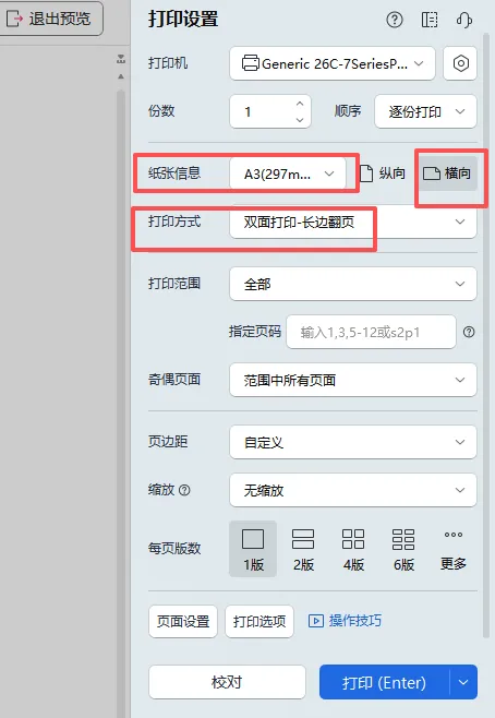 打开您的A4文档,点击【文件】-【打印】-【打印预览】,在打印机属性中选择A3纸张大小,方向为横向以及双面打印。