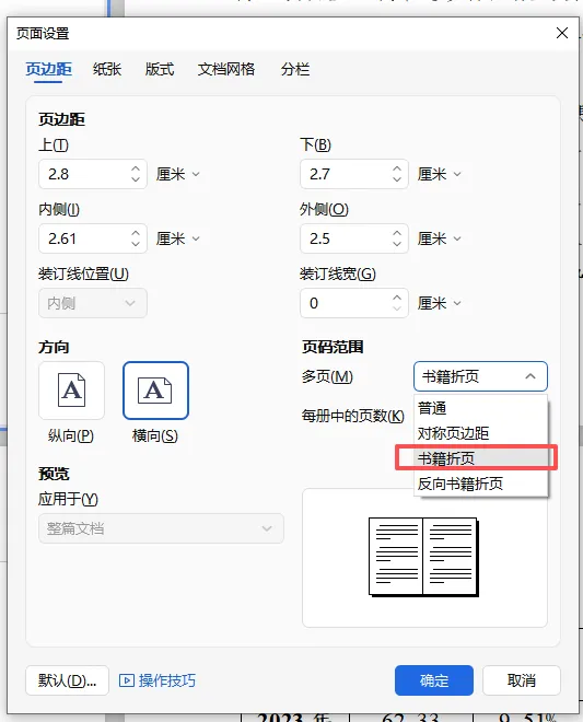2、再点上图左下角的【页面设置】中,选择【纸张】标签,将纸张方向设为横向,将多页选项设为书籍折页。然后根据页面情况,调整一下页边距。